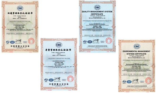 目前美(měi)泰克(天津)礦物(wù)有(yǒu)限已經通(tōng)過了(le)以下✔£™≈(xià)質量體(tǐ)系認證: ISO 9®≥001 ISO 14001 我們将“始終為(wèi)您提供高(gāo)品質的(d$♠γe)各類産品”!